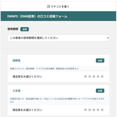 口コミ投稿フォームでは、使用期間・各項目の評価・コメント内容などを入力します。評価は「信頼性」「入出金」「取引環境」「取引ツール」「サポート対応」などの項目ごとに選択でき、実際の使用感を反映した評価を投稿できます。