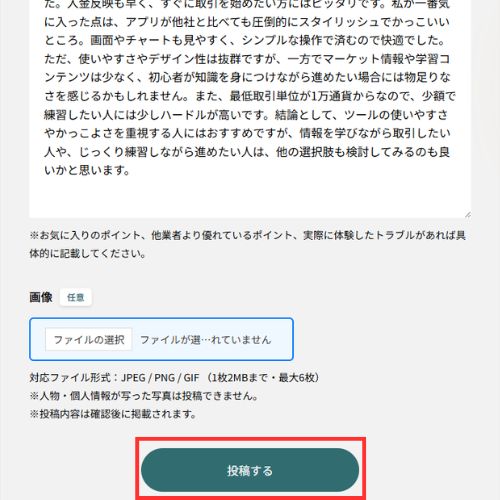 また、必要に応じてスクリーンショットなどの画像を添付することも可能です。実際の取引画面や履歴などの画像は、口コミの信頼性を高める情報として役立ちます。