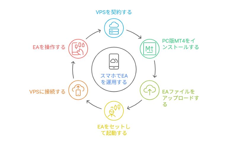 スマホ単体では不可能ですが、VPS(Windows Server)+PC版MT4を使えばスマホからEAを遠隔操作できます。ただし、実際にEAを動かしているのはVPS内の「PC版MT4」です。