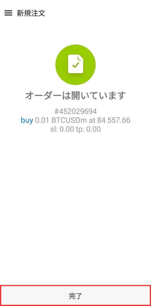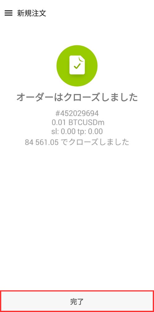 オーダーはクローズしましたの画面が表示されたら、決済注文が完了となります。