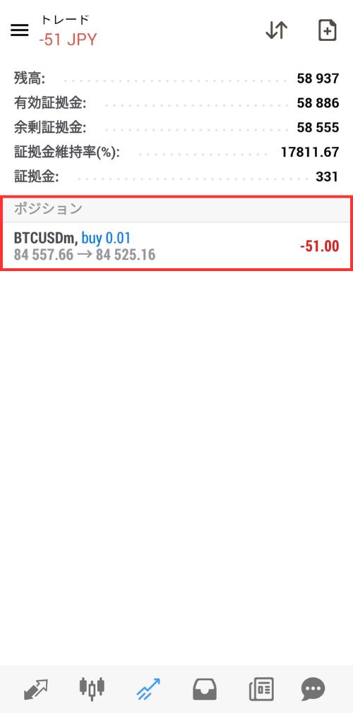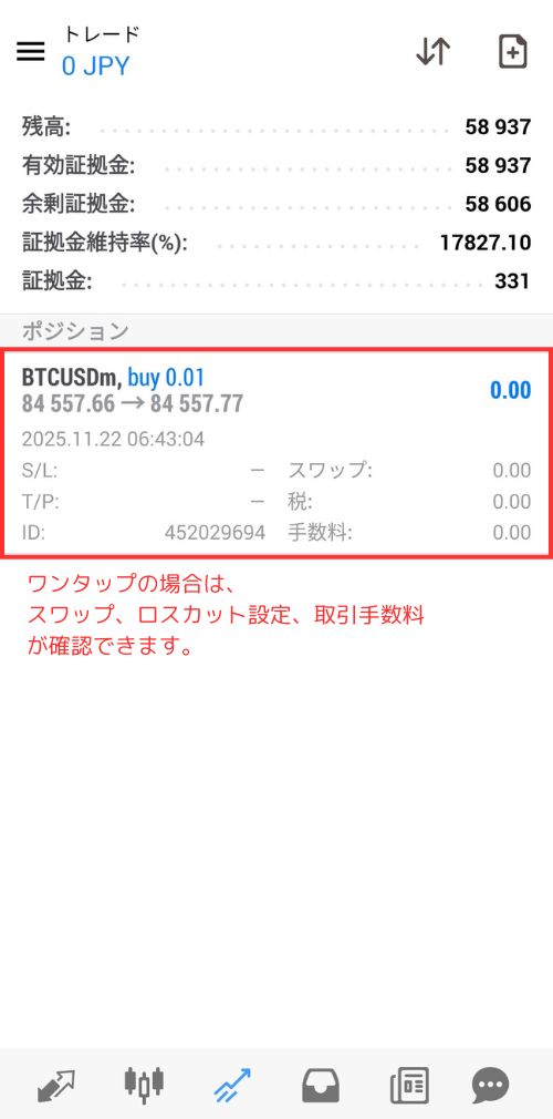 注文が通ると「オーダーは開いています」のメッセージが表示され、トレード画面に「ポジション」の項目が追加されます。