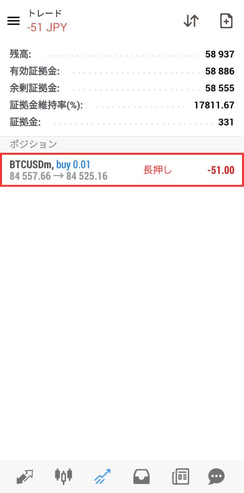 ポジションを保有している状態では、チャート画面に保有しているポジションが表示されます。