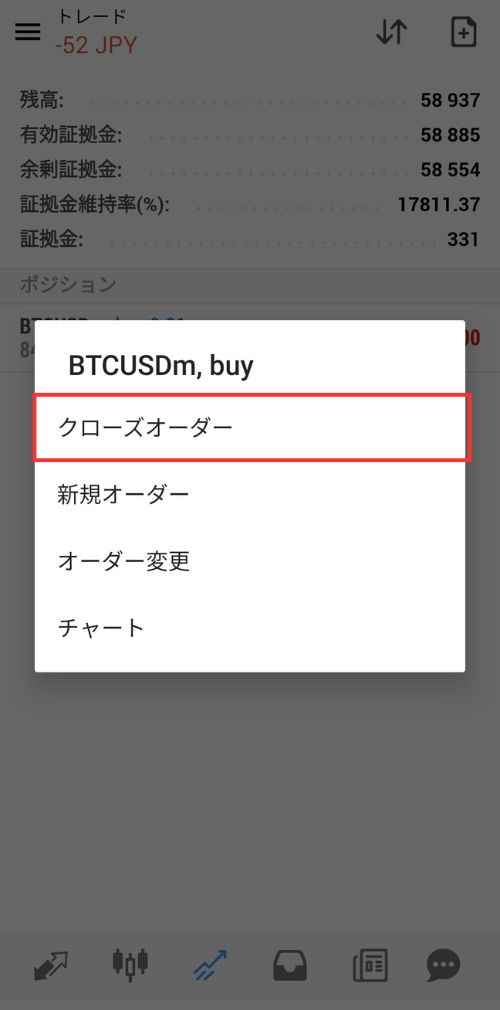 ポジションに表示されている通貨ペアを長押しすると、ポップアップが表示されますので「クローズオーダー」を選択します。